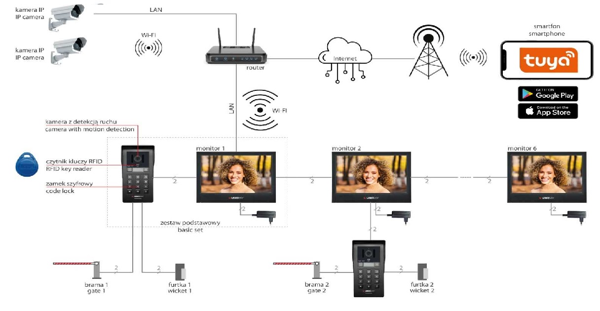 Monitor można podłączyć do lokalnej sieci komputerowej (wi-fi, kabel) z dostępem do internetu. Dzięki temu z wideodomofonu można również korzystać na urządzeniach mobilnych z aplikacją Tuya.
